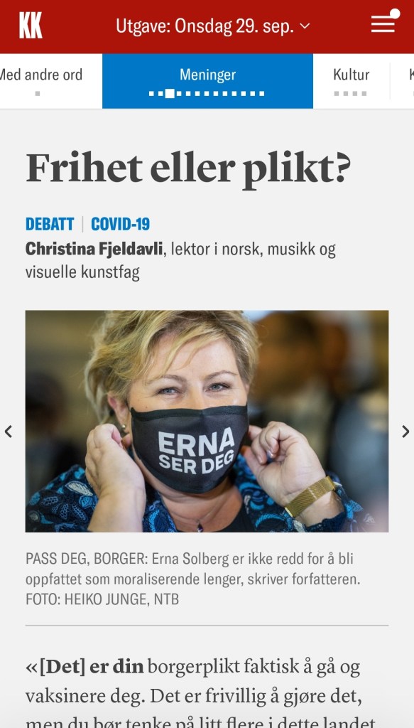 Som Høyre-politiker har Erna Solberg ofte gjort seg selv til talsperson for individuell frihet. På innpust og utpust har hun liret av seg ord som «valgfrihet», «fritt behandlingsvalg» og «fritt skolevalg». Også koronavaksinering skal være «frivillig», har både helsemyndighetene og statsministeren forsikret oss om. Parallelt med dette har den norske befolkningen blitt utsatt for et sterkt vaksinepress. 23. september kunne NRK fortelle om Iselin Kavli Paulsen (21) som ble innlagt på sykehuset med hjertebetennelse etter å ha tatt andre dose av Moderna-vaksinen. «Jeg følte meg presset av media, samfunnet rundt meg, venner og familie. Jeg fikk høre at for å kunne delta i samfunnet måtte jeg ta denne vaksinen», sier hun til NRK. Preben Aavitsland, som er overlege ved Folkehelseinstituttet (FHI) synes det er «leit at hun har følt et press». Slik han ser det, har FHI «vært veldig tydelige på at dette er et fritt valg». Dagen etter står statsministeren frem på tv og påstår at vaksinering er en «borgerplikt».
